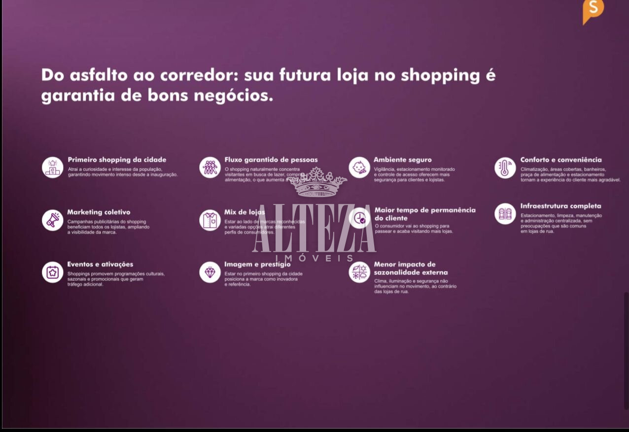 Estar em um shopping garante maior visibilidade, aumento de vendas e valorização do seu negócio, além de posicionar sua marca em um ponto estratégico da cidade.